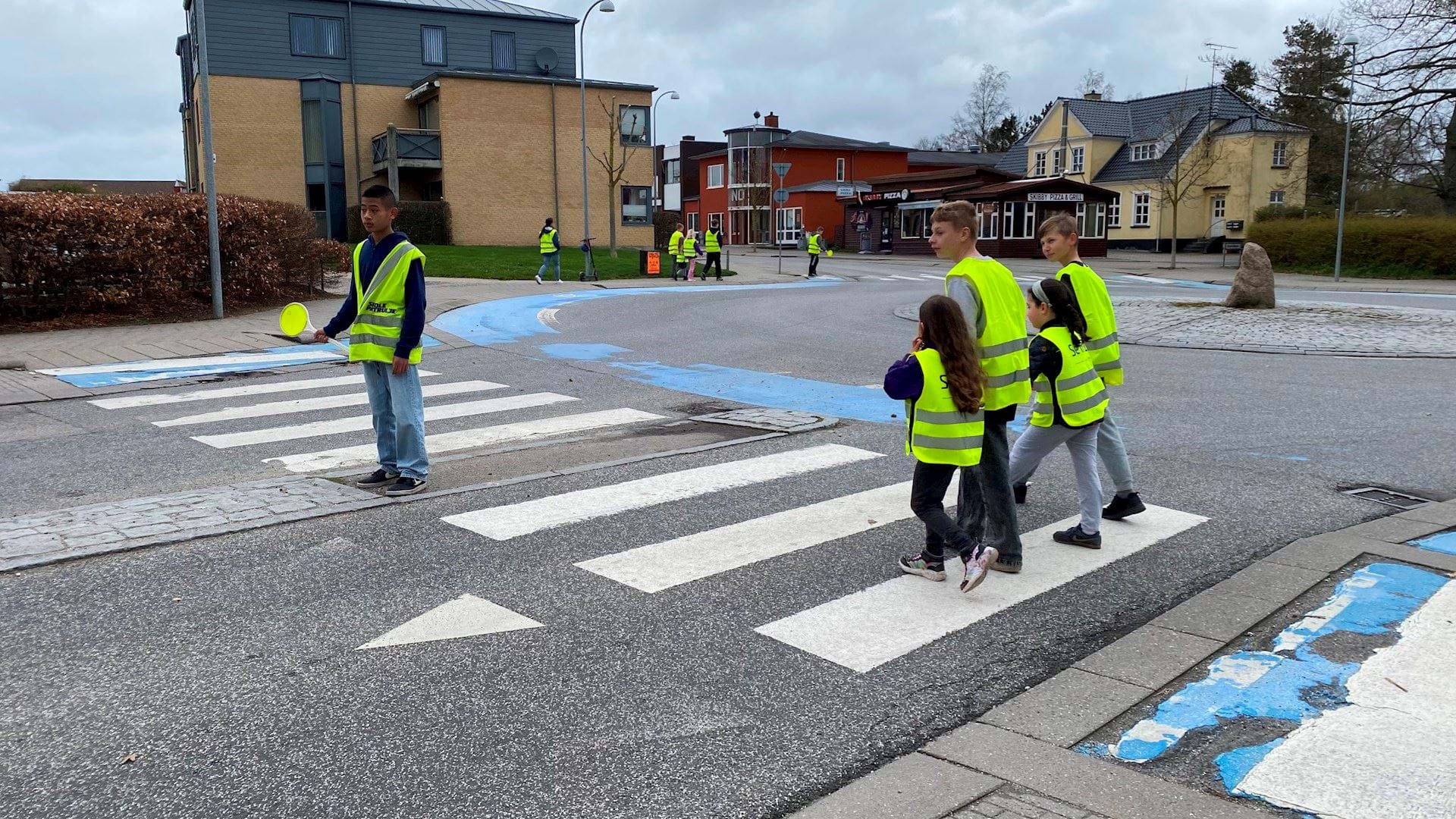 Store elever hjælper mindre elever med gåprøven i Skibby.